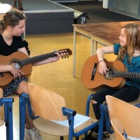 De gitaarlessen zijn gestart. Met een van school geleende gitaar leren de kin...